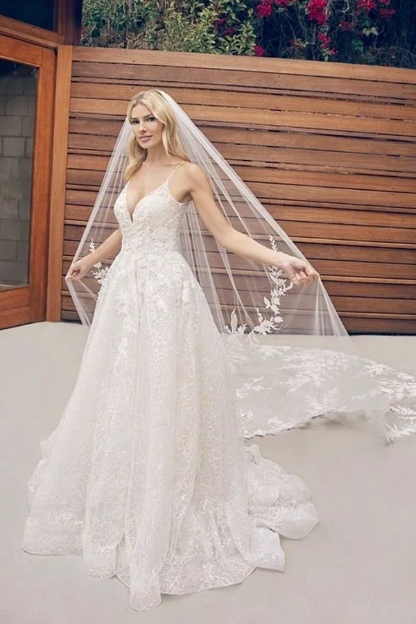 Dreamy CALLIE is for the modern bride, she has classic spaghetti straps and a plunging V-neckline. V-cutouts on the sides of the bodice show a subtle amount of skin, complemented by a low V-back. An A-line silhouette is universally flattering, which means this dress will look flawless on every shape and size.